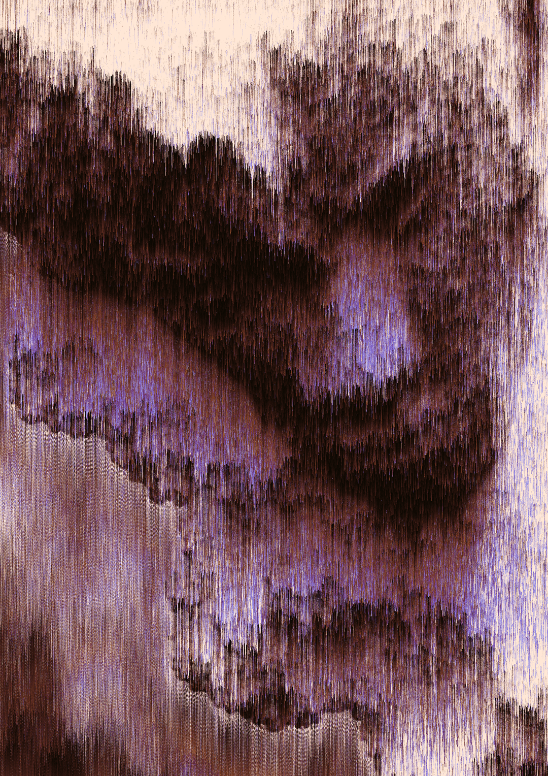 Virga emerges from a multi-layered system, generated entirely with code. Through a sophisticated rendering process, Watkins reimagines rain as cascading streaks of pixels, their shifting density forming textured backdrops against which obscure faces emerge. Some appear clearly defined, as if stepping forward from the deluge, while others dissolve into the rainfall, sketch-like and spectral. This interplay of movement, mystery, and realism recalls the delicate nuances of Old Master sketches, where mere traces of lines evoke profound emotional depth. As the faces morph and distort, they oscillate between human likeness and biomorphic structures like corals and shells, inspired by the intricate scientific sketches of German biologist Ernst Haeckel.